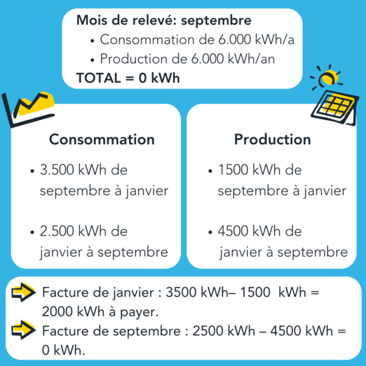 - Facture de janvier : Entre septembre et janvier, votre consommation (3.500 kWh) dépasse votre production (1.500 kWh). Vous devrez donc payer la différence : 3.500 - 1.500 = 2.000 kWh à payer.